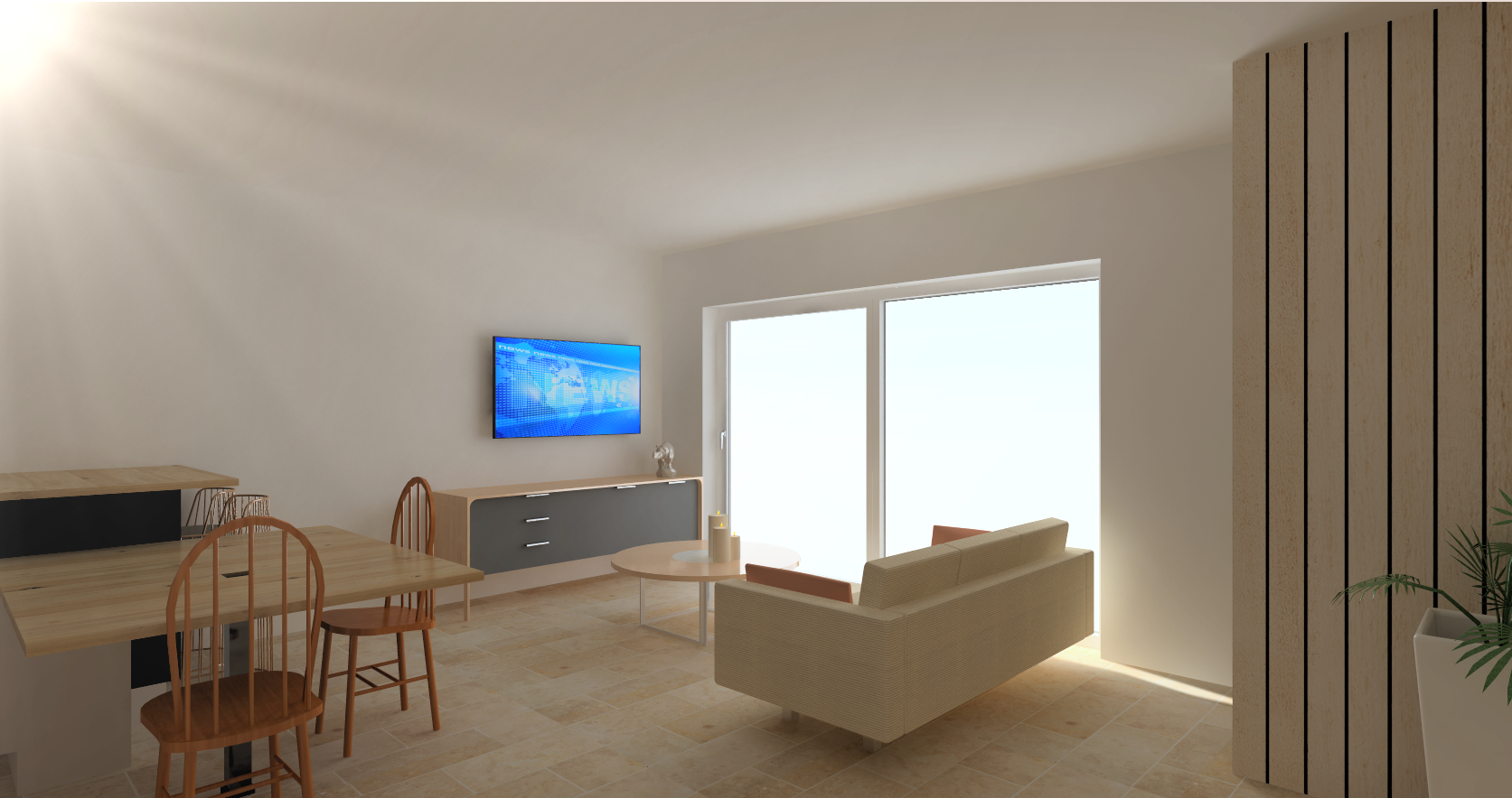 Ce logement développe une superficie de 47 m2 + balcon/terrasse couvert de 8m2. Chambre et salle de bain à létage